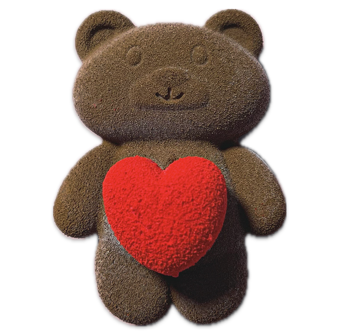 Un tenero orsetto di semifreddo alla gianduia con nocciole tostate, Â cuoricino cremoso di vaniglia sopra la pancia. Base di pan di spagna. Velvet rosso e marrone come copertura.